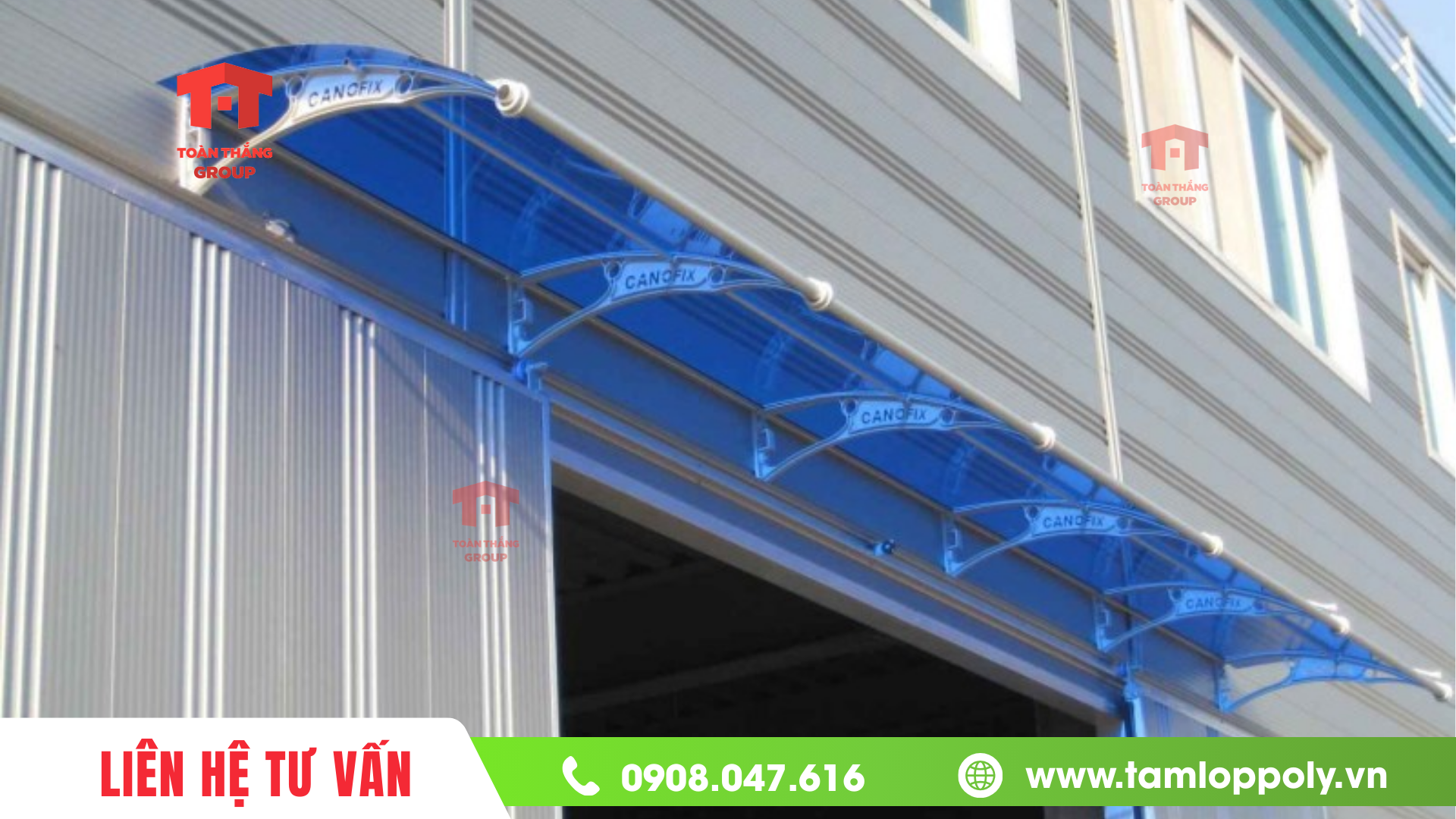 Mái canopy sử dụng tấm lấy sáng poly đặc màu xanh, trắng đục