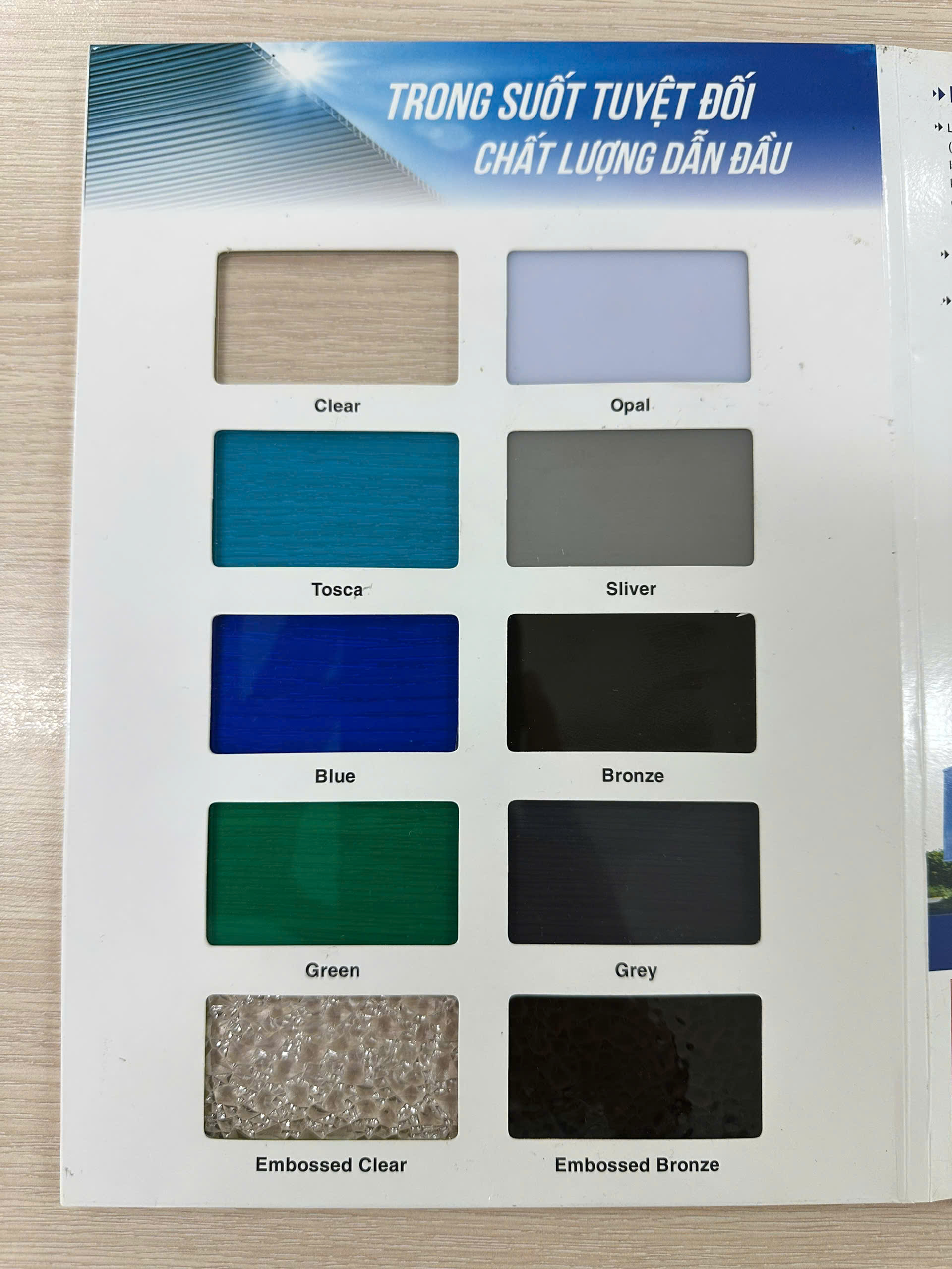 Không gò bó trong một vài lựa chọn, tấm lấy sáng poly sở hữu bảng màu phong phú. Các nhà kiến trúc có thể chọn màu Trắng trong (Clear) để lấy sáng tối đa, màu Xanh (Blue) để tạo cảm giác mát mẻ, hay màu Trà (Bronze) để mang lại vẻ sang trọng cổ điển.