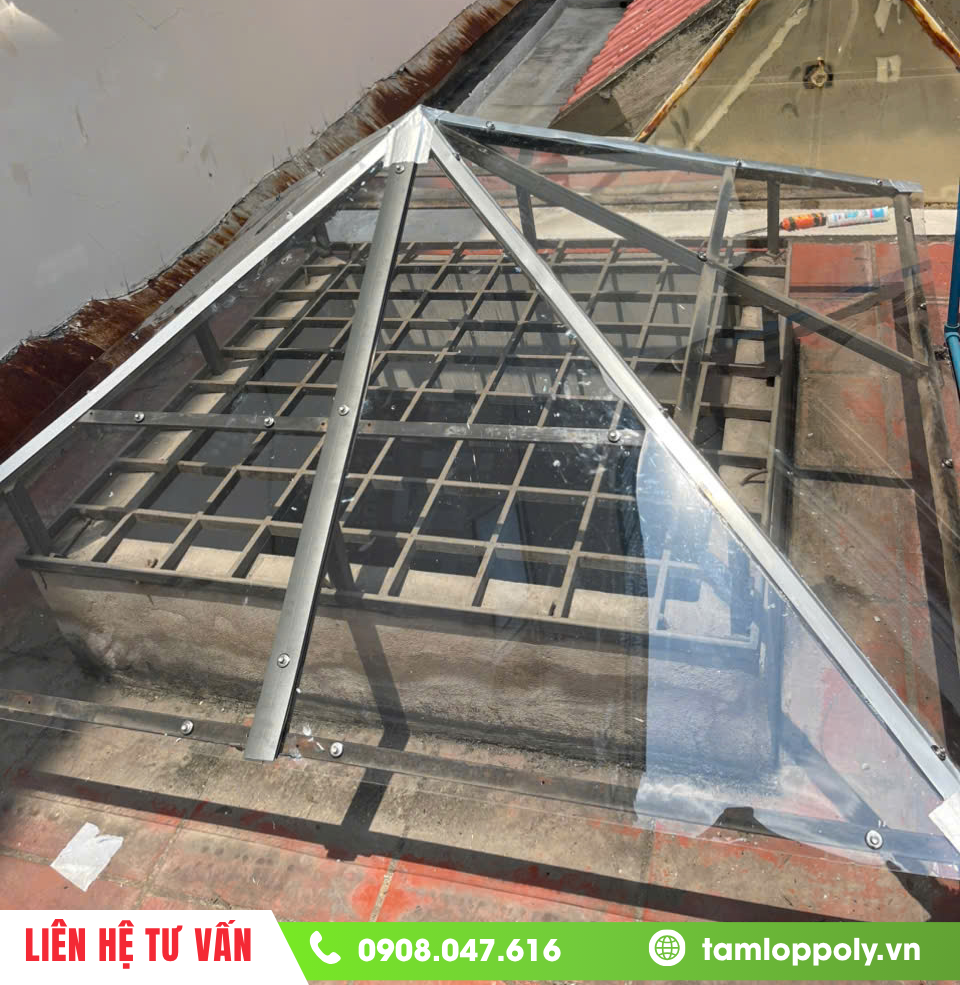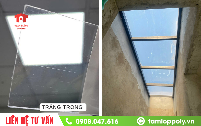 Về mặt thẩm mỹ, tấm poly trong suốt mang lại cảm giác hiện đại, sạch sẽ và phù hợp với các thiết kế cần sự tối giản hoặc lấy sáng tối đa. Đây là lựa chọn phổ biến cho giếng trời hoặc các công trình yêu cầu độ sáng cao.
